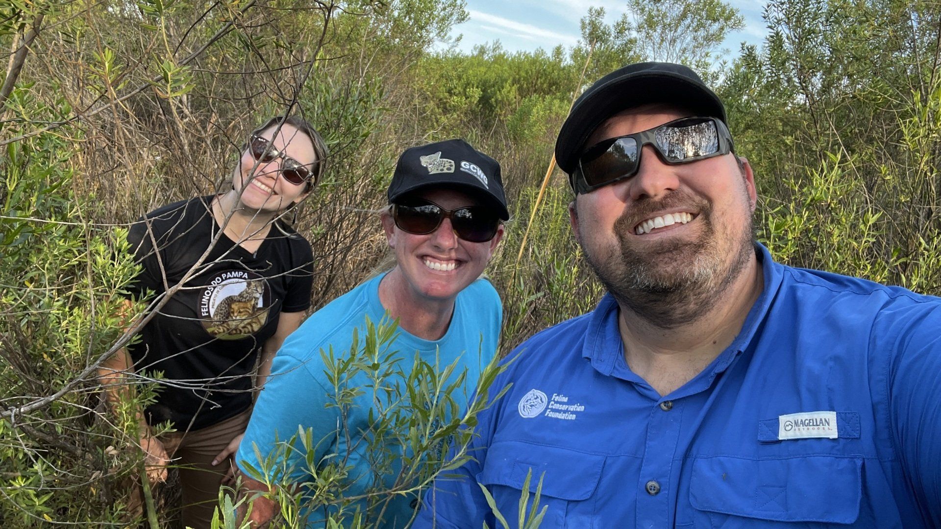 After over a year of planning, we traveled to Porto Alegre, Brazil in November to team up with our friends and partners with the Geoffroy’s Cat Working Group to join them in the field! Once we landed in Porto Alegre, we drove 5-hour south towards Uruguay to a little town called Seival. It was a beautiful drive through the Brazilian Pampa biome, where we met Felipe, Marina, and Flavia, and started our first afternoon using telemetry to track wild Geoffroy’s cats through GPS collars. Felipe is tracking wild Geoffroy’s cats and feral cats in the area to study any over lapping ranges and determine the threat of the feral cats transferring possible diseases to wild cats. To use telemetry, we used a large antenna that would start to beep if we were in an area close to a cat. Each collar using a different radio frequency so we could identify each cat. Geoffroy’s cats are so small they are unable to wear a bigger collar that pings with a satellite in real time, so to be able to collect data from these smaller collars we had to get within 50 meters of a cat to download all the information to a second telemetry device. Another innovated researching technique is the small GPS collars on the Geoffroy’s cats are only turned on for 5-hours every day. This helps saves the battery life so the collars can collect data for almost 6 months instead of 1 month. This brilliant battery saver is great, but it also meant we only had a small window to try and collect data from the cats. Luckily, during our 6 days out in the field we were able to download data from 7 cats!
