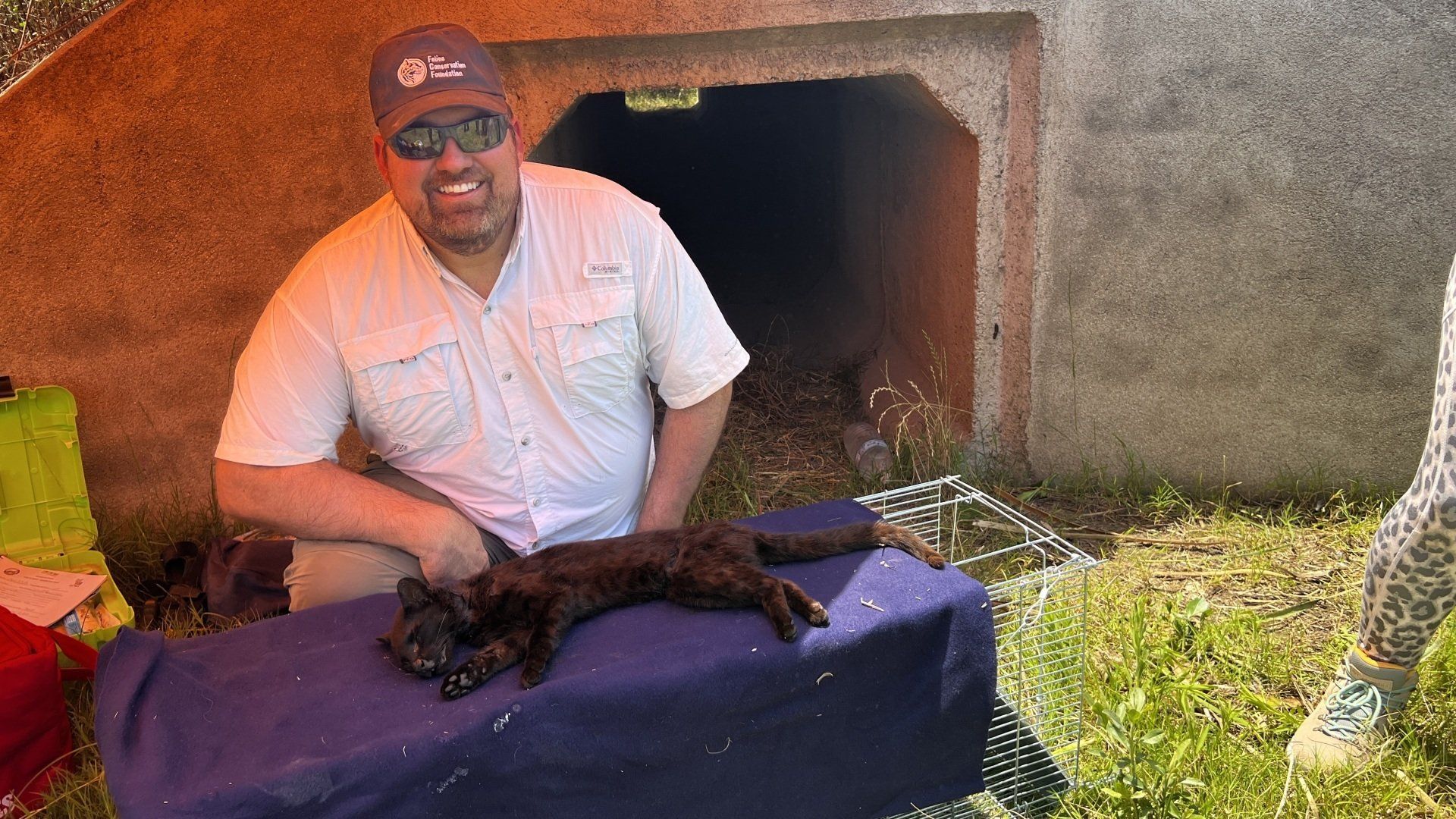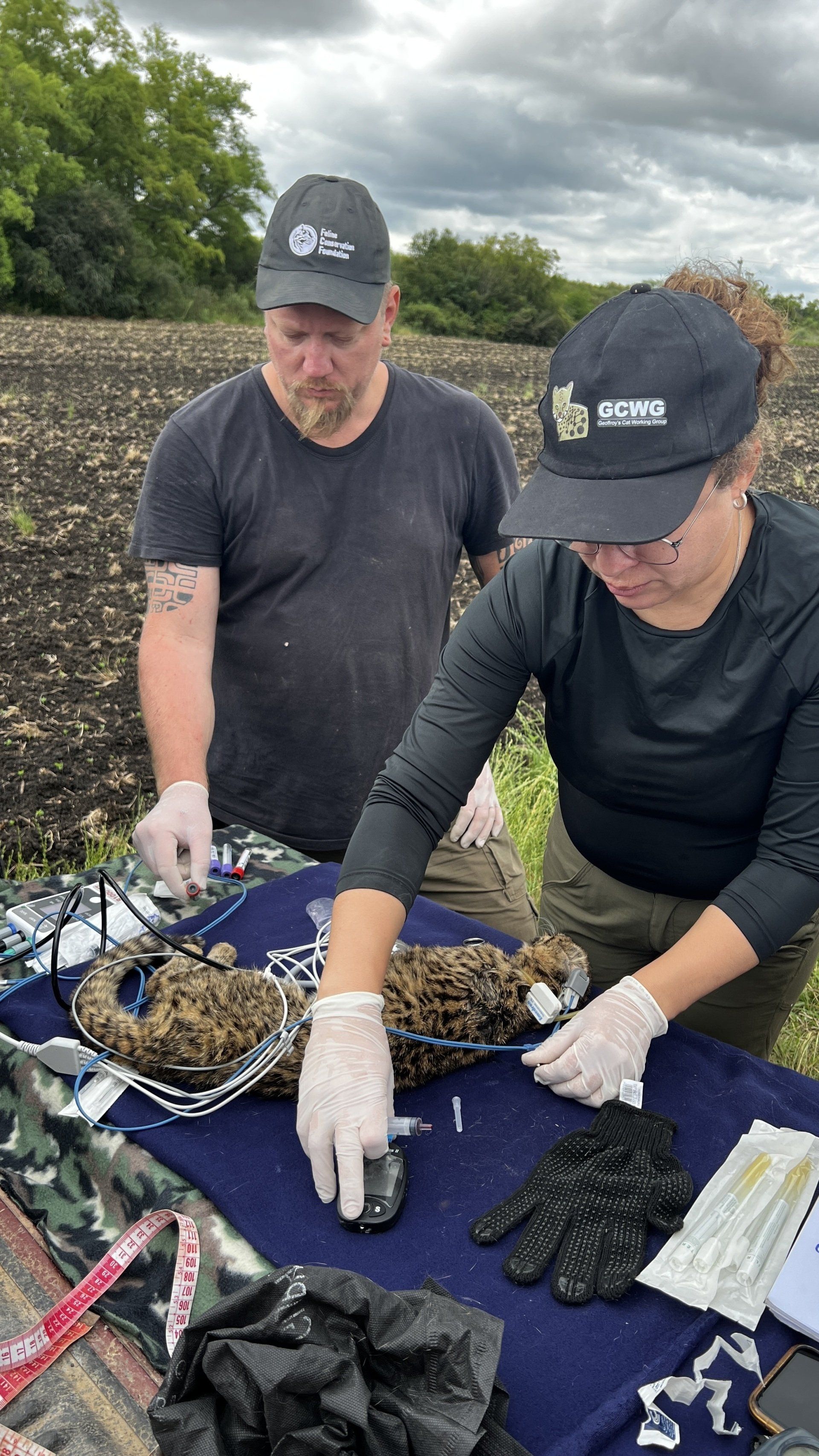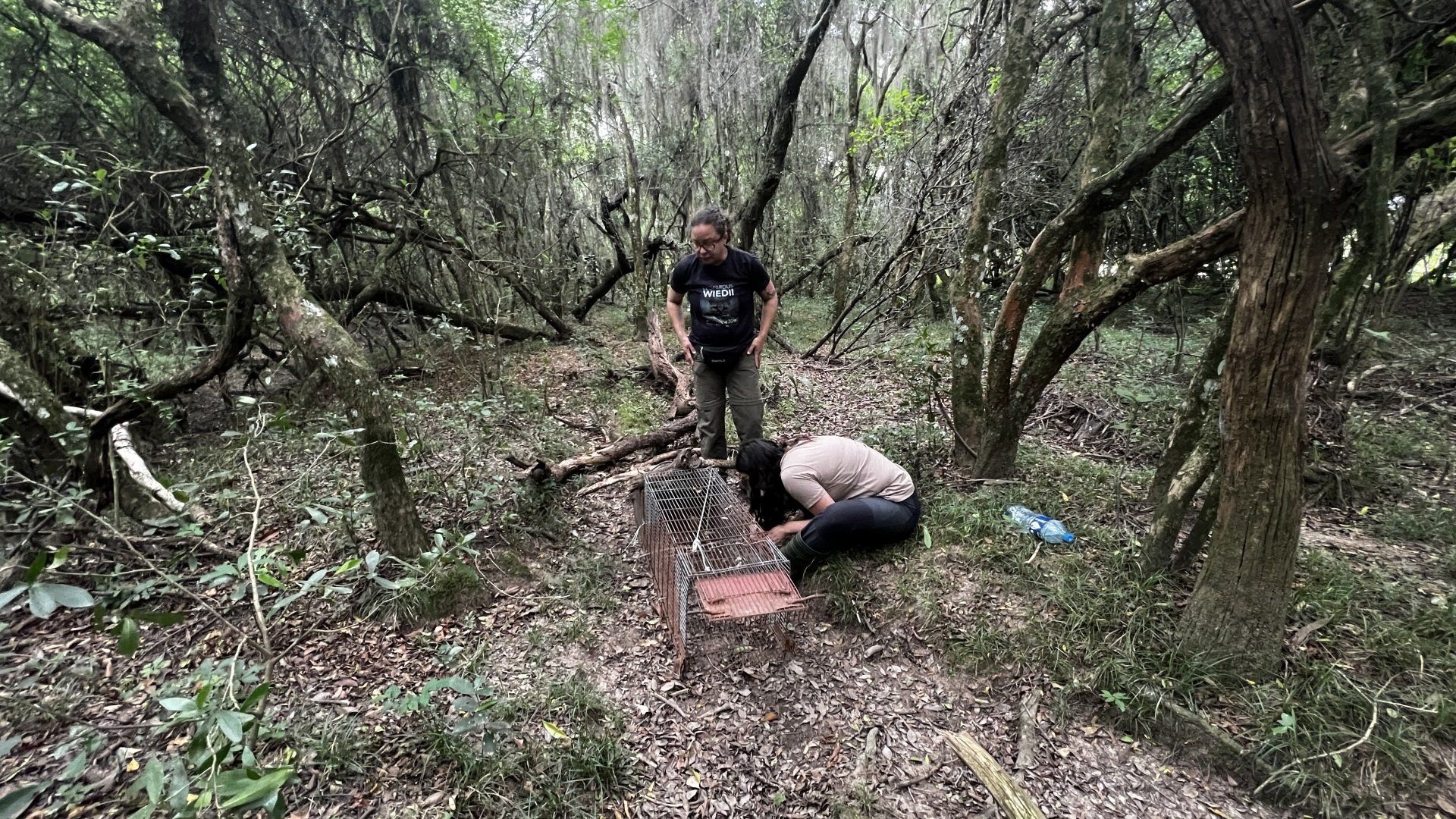 Each morning we started the day going out to check traps for Geoffroy’s cats. We had 12 traps set and baited with live pigeons (the pigeons and cats were not harmed in this process). The traps had a protected area with food and water that the Geoffroy’s cats would safely be housed until we were able to get to them. Our very first morning, we went to the second trap and there was a beautiful melanistic Geoffroy’s cat sitting in it!! This trap was in a nice, shaded location right by a tunnel that was built under the roadway to give wildlife a safe passage to cross under the busy road! We quickly went to check all other traps, one did have a Pampas fox in it, that was safely released, but with no other cats were in the traps. After checking all the traps, we headed back to do a full work up on our first cat! Dr. Ana is a wildlife vet that joins Felipe and Marina during every capture campaign (they have permits with the government to trap and collect data on these wildcats and do capture campaigns every 3 months in this area). While Dr. Ana tended to the cat and sedated it, the rest of us set up a field clinic in a shaded area to keep the cat cool and comfortable during the work up. Once she was anesthetized, Felipe weighted the cat and took all sorts of measurements of her. He measured her length, the size of her paws, ears, and teeth! Once measurements were completed, Dr. Ana hooked the cat up to a machine to monitor all her vitals. She then collected blood work to test for genetics, parasites, funguses, and glucose levels. While this is done Felipe also takes hair samples to test for toxins and inspects for any ticks and overall body condition. All this data collected is very important for future studies. Once the entire work-up was done, the cat got fluids and a shot of vitamins before being woken up. The Geoffroy’s cat was placed back into the trap to wake up, so she was not too startled or afraid. This melanistic female was a new cat that had not been trapped yet, so we had the honor of naming her Brilie, a combination of Brain and Kylie. Brilie was only about 5 pounds and too small to have a GPS collar placed on her. We left her back in the trap, in the tunnel passage, and came back a few hours later once she was fully awake to release her. We angled her trap towards a nice area of dense bushes, a perfect area for her to run and hide. Brian and I opened the trap door to release her. It was an amazing experience getting to help collect so much valuable data from a wild Geoffroy’s cat and then to see her run free.