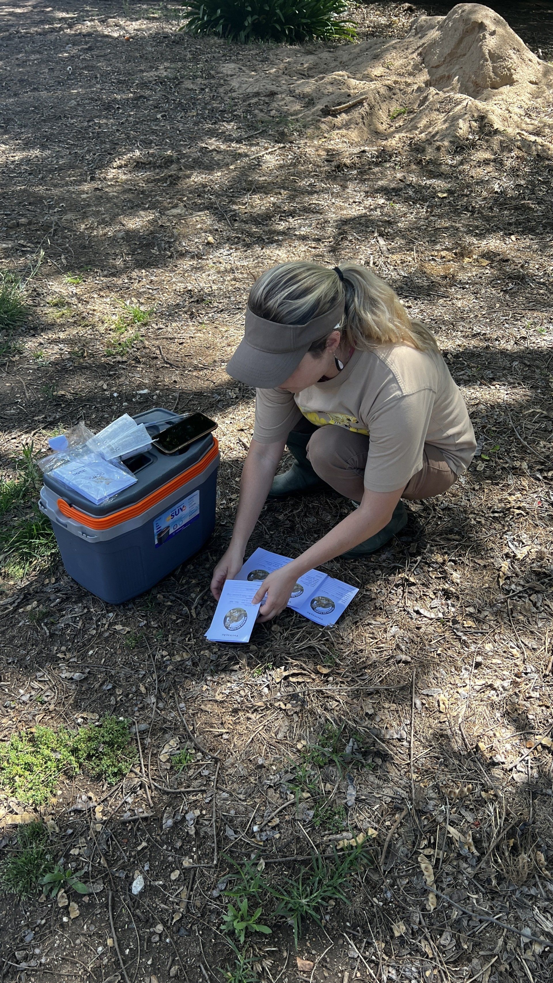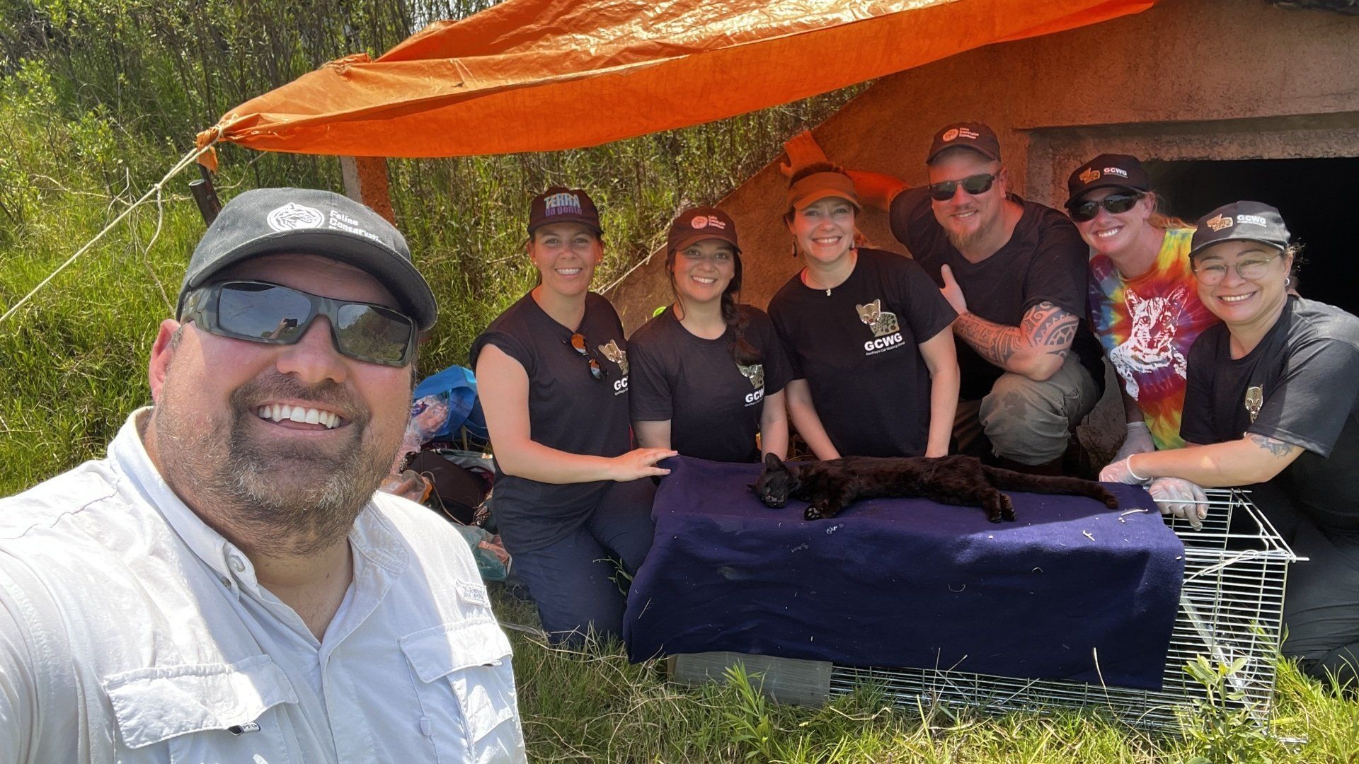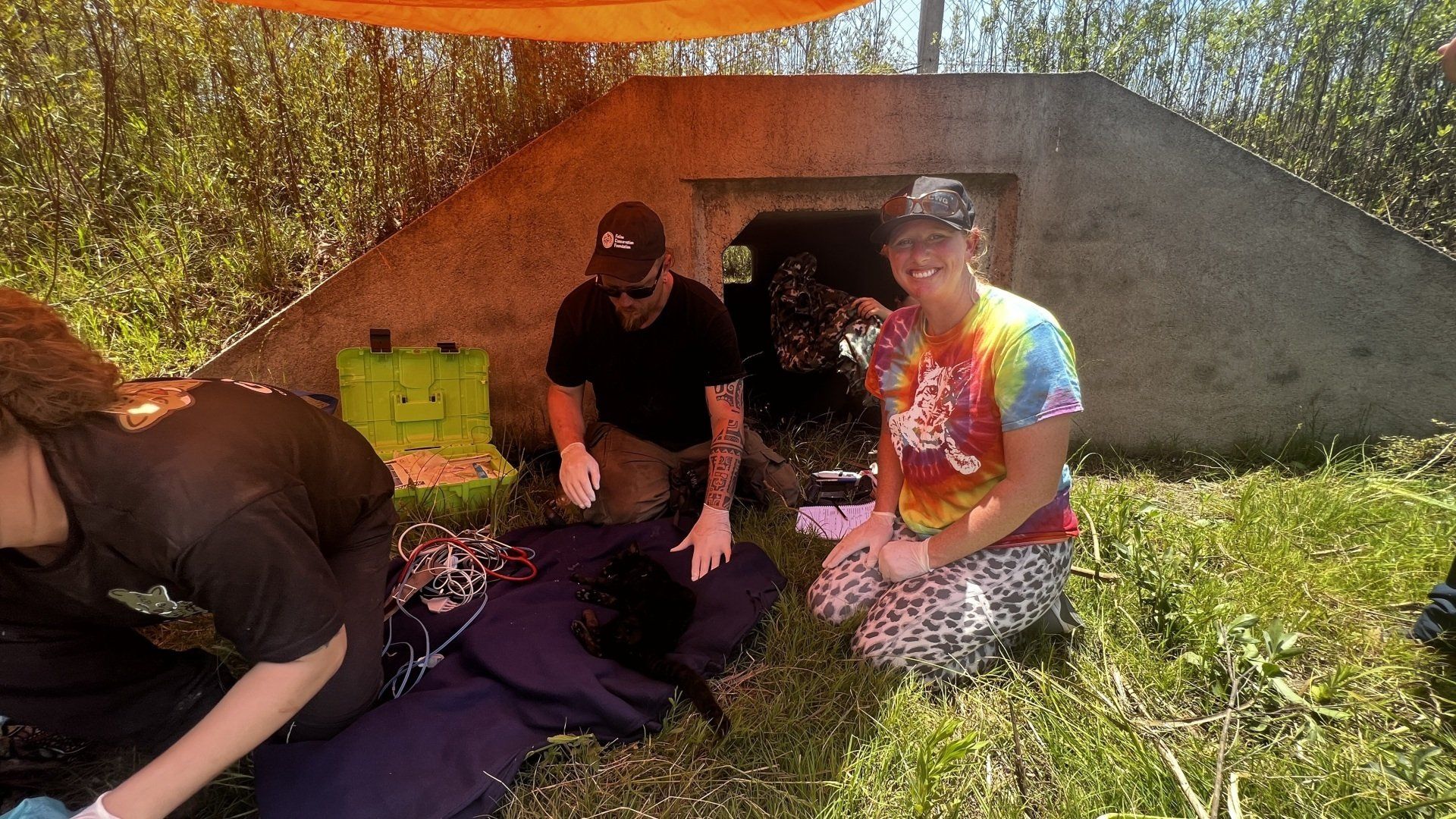 Each morning we started the day going out to check traps for Geoffroy’s cats. We had 12 traps set and baited with live pigeons (the pigeons and cats were not harmed in this process). The traps had a protected area with food and water that the Geoffroy’s cats would safely be housed until we were able to get to them. Our very first morning, we went to the second trap and there was a beautiful melanistic Geoffroy’s cat sitting in it!! This trap was in a nice, shaded location right by a tunnel that was built under the roadway to give wildlife a safe passage to cross under the busy road! We quickly went to check all other traps, one did have a Pampas fox in it, that was safely released, but with no other cats were in the traps. After checking all the traps, we headed back to do a full work up on our first cat! Dr. Ana is a wildlife vet that joins Felipe and Marina during every capture campaign (they have permits with the government to trap and collect data on these wildcats and do capture campaigns every 3 months in this area). While Dr. Ana tended to the cat and sedated it, the rest of us set up a field clinic in a shaded area to keep the cat cool and comfortable during the work up. Once she was anesthetized, Felipe weighted the cat and took all sorts of measurements of her. He measured her length, the size of her paws, ears, and teeth! Once measurements were completed, Dr. Ana hooked the cat up to a machine to monitor all her vitals. She then collected blood work to test for genetics, parasites, funguses, and glucose levels. While this is done Felipe also takes hair samples to test for toxins and inspects for any ticks and overall body condition. All this data collected is very important for future studies. Once the entire work-up was done, the cat got fluids and a shot of vitamins before being woken up. The Geoffroy’s cat was placed back into the trap to wake up, so she was not too startled or afraid. This melanistic female was a new cat that had not been trapped yet, so we had the honor of naming her Brilie, a combination of Brain and Kylie. Brilie was only about 5 pounds and too small to have a GPS collar placed on her. We left her back in the trap, in the tunnel passage, and came back a few hours later once she was fully awake to release her. We angled her trap towards a nice area of dense bushes, a perfect area for her to run and hide. Brian and I opened the trap door to release her. It was an amazing experience getting to help collect so much valuable data from a wild Geoffroy’s cat and then to see her run free.