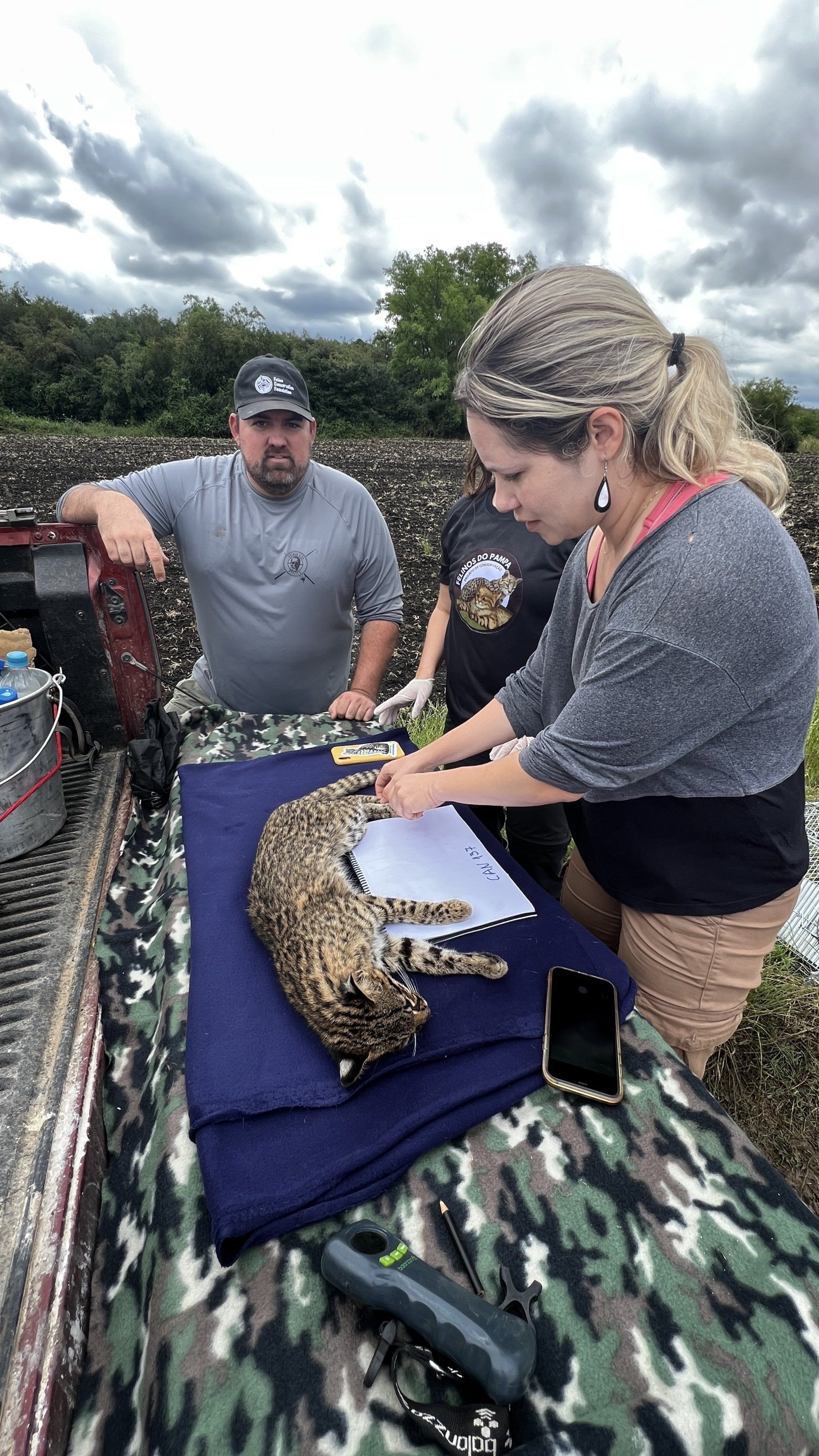 Spending so much time driving and searching for wild Geoffroy’s cats, we, of course, came across many other wild animals that share the region. We saw capybaras relaxing by a nice big pond, foxes hunting along the road, tegus, rhea, skunk, deer, Quaker parrots, and many other beautiful birds. Unfortunately, we also saw the impacts of humans as well. A very large coal mine was built in 2016 which also brought with it a large, paved road and many workers commuting each day. There were many animals we saw along that road that had been hit. There is also a high demand for soy crops which is causing many farmers to turn their land into soy fields harvested every 6 months, instead of natural land for cattle. Much of the land is now fragmented because of this, only leaving protected areas around waterways untouched. This seems to be the only areas the Geoffroy’s now use. And on one of our final days, we got a unfortunate call that a farmer had found a Geoffroy’s cat dead in his field, with one of the GPS collars on it. We went to find the cat, which turned out to be the biggest male they had trapped, Gatado. It was good to still be able to retrieve the collar and after reviewing the data on it he had sadly been hit by a car. He had the largest range of any of the collard cats, about 12 square miles. This was very sad to find, but also important to help the GCWG continue to help protect these cats from human conflicts. They have already been putting up road signs to make drivers aware of the area and may help with the future construction of more tunnels and fencing to prevent car strikes all together.